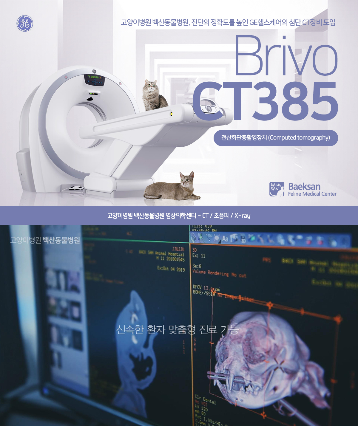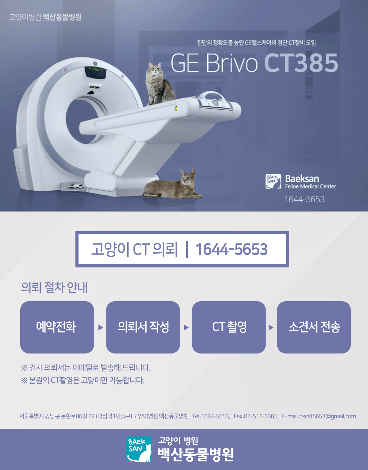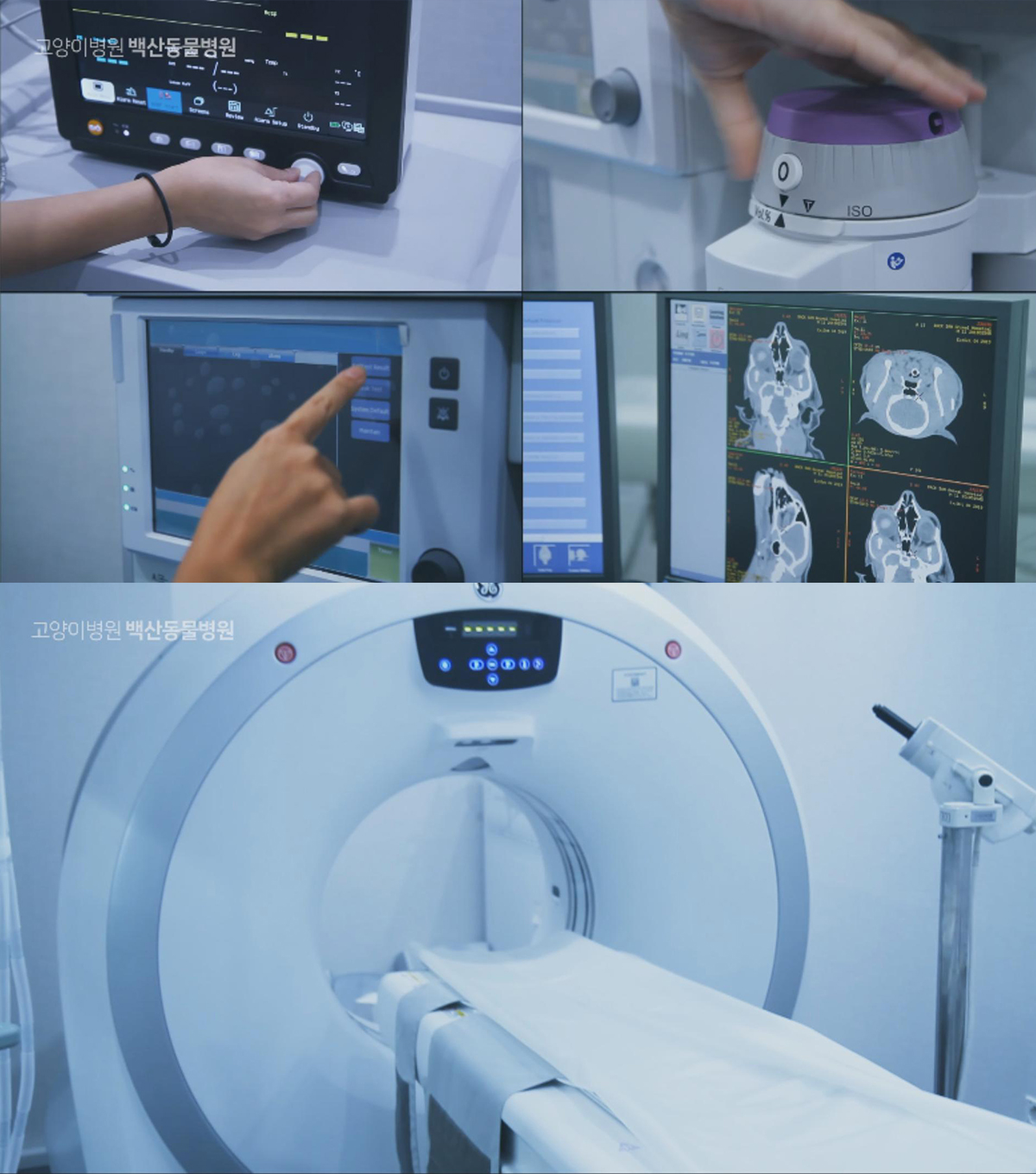 고양이병원 백산동물병원은 고양이병원 최초로 원내에 CT를 도입했습니다. 이제 원내에서 빠르고 정확한 진단과 수술로 이어지는 과정이 원스톱으로 이루어지게 됩니다.