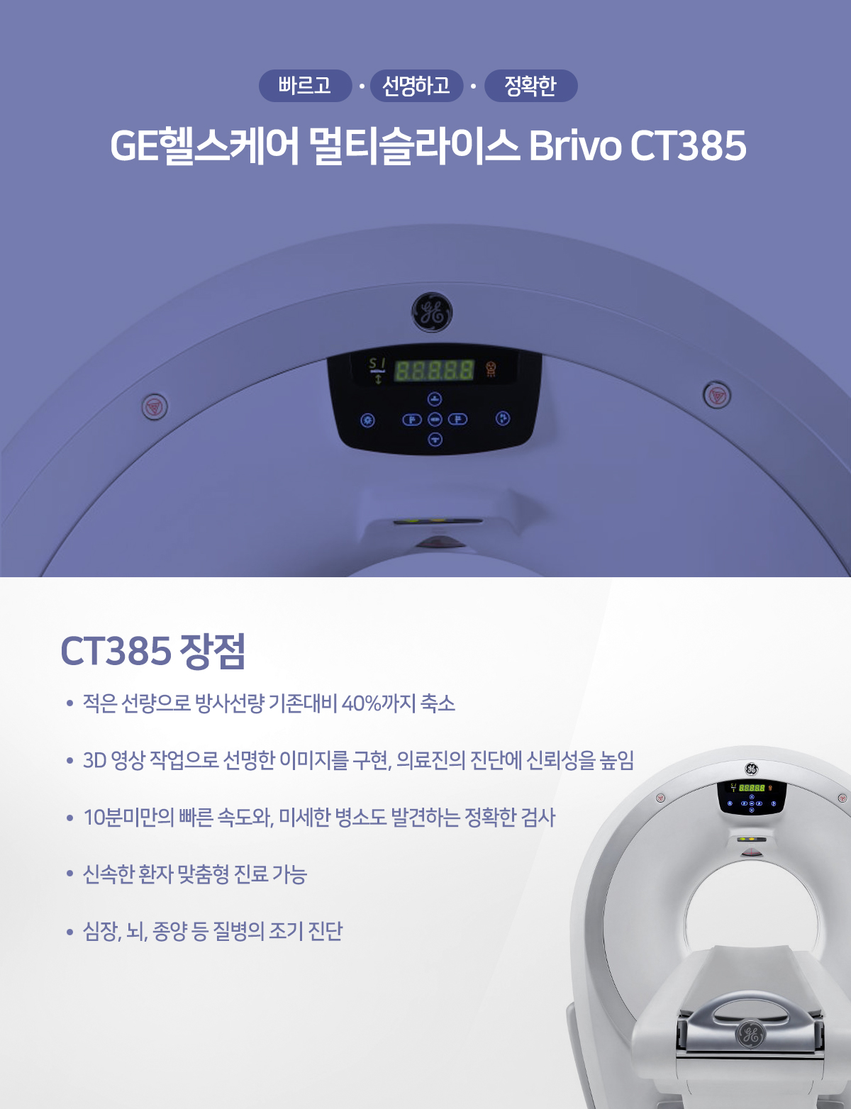CT385는 고화질 영상으로 빠르고 낮은 선량을 제공(저선량 솔루션 ‘에이서(ASiR)’)하며, 각각의 환자에 맞는 신속한 맞춤형 진료가 가능한 첨단영상 기기 입니다. GE헬스케어의 스마트한 CT 플랫폼으로 모든 부위의 방사선 피폭량을 기존 제품 대비 40% 줄이며, 고해상 이미지 구현이 가능합니다.