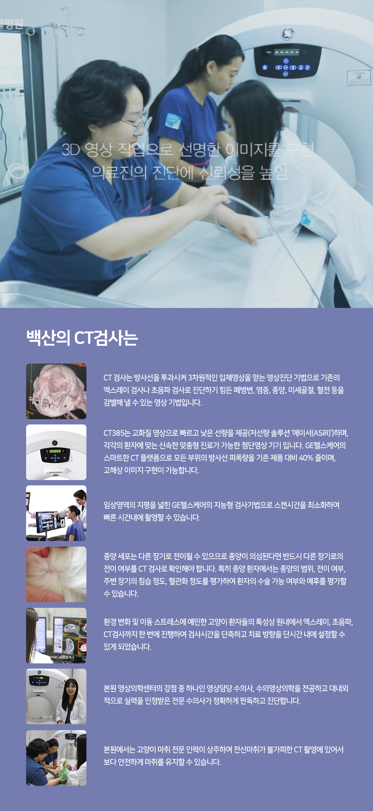 CT 검사는 방사선을 투과시켜 3차원적인 입체영상을 얻는 영상진단 기법으로 기존의 엑스레이 검사나 초음파 검사로 진단하기 힘든 폐병변, 염증, 종양, 미세골절, 혈전 등을 감별해 낼 수 있는 영상 기법입니다.