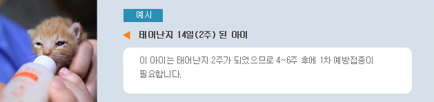 - 집으로 입양한 지 일주일 정도 지나고, 식욕과 배변/배뇨에 이상이 없으면서 체중이 500-600g 이상 나간다면 병원에 내원하여 예방 접종이 가능합니다.