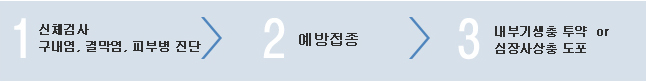 또한, 건강 상태 및 연령에 맞추어 내부기생충 구충제를 투약하거나 또는 심장사상충을 비롯한 내외부기생충 구충제를 도포합니다.